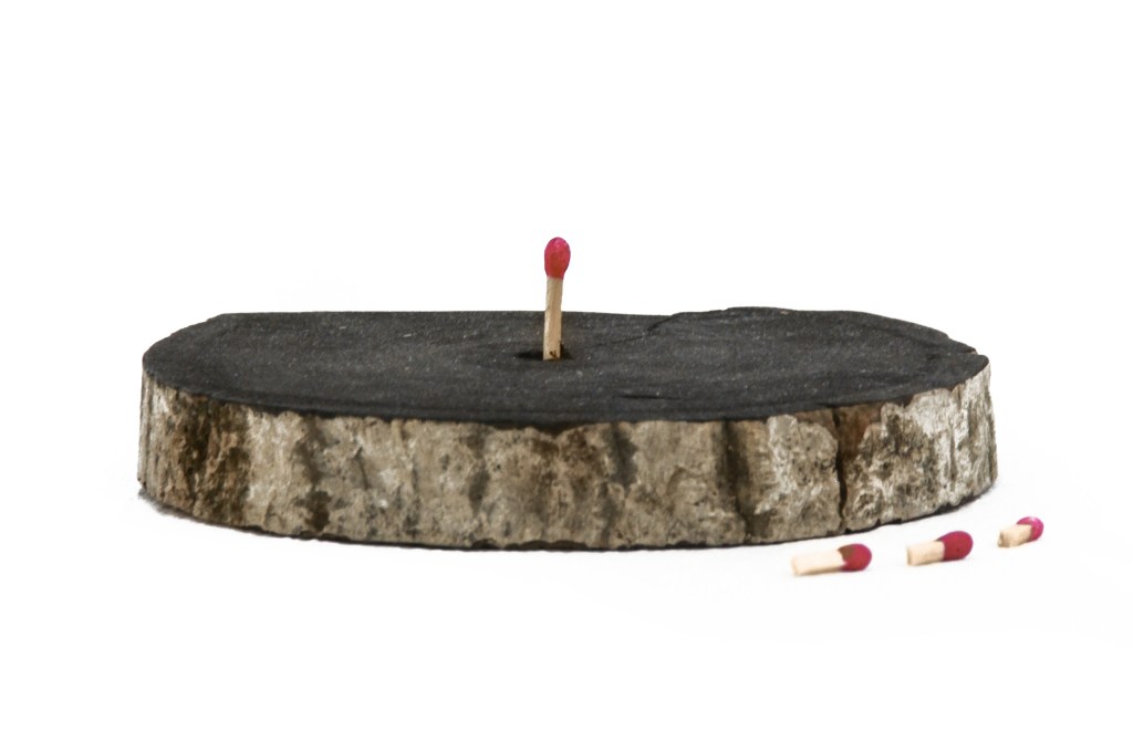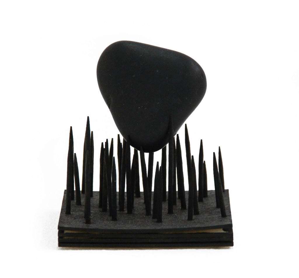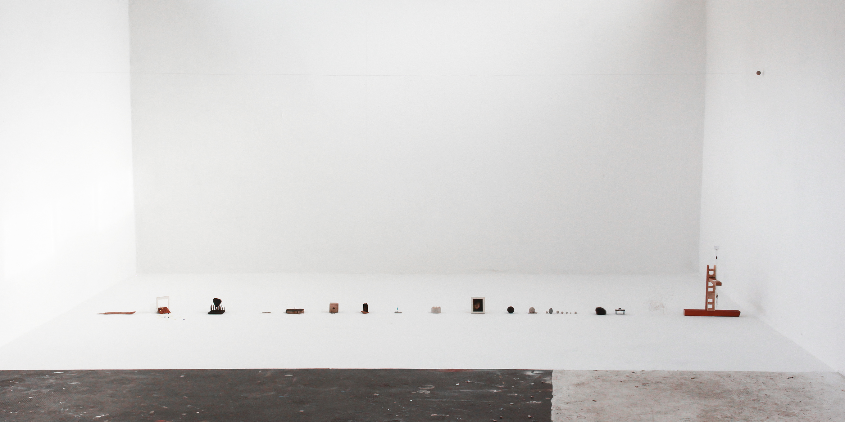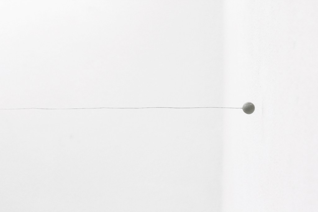 At the end of the wire there is a clay sphere that floats in the air. A row of minature sculptures are positioned underneath.