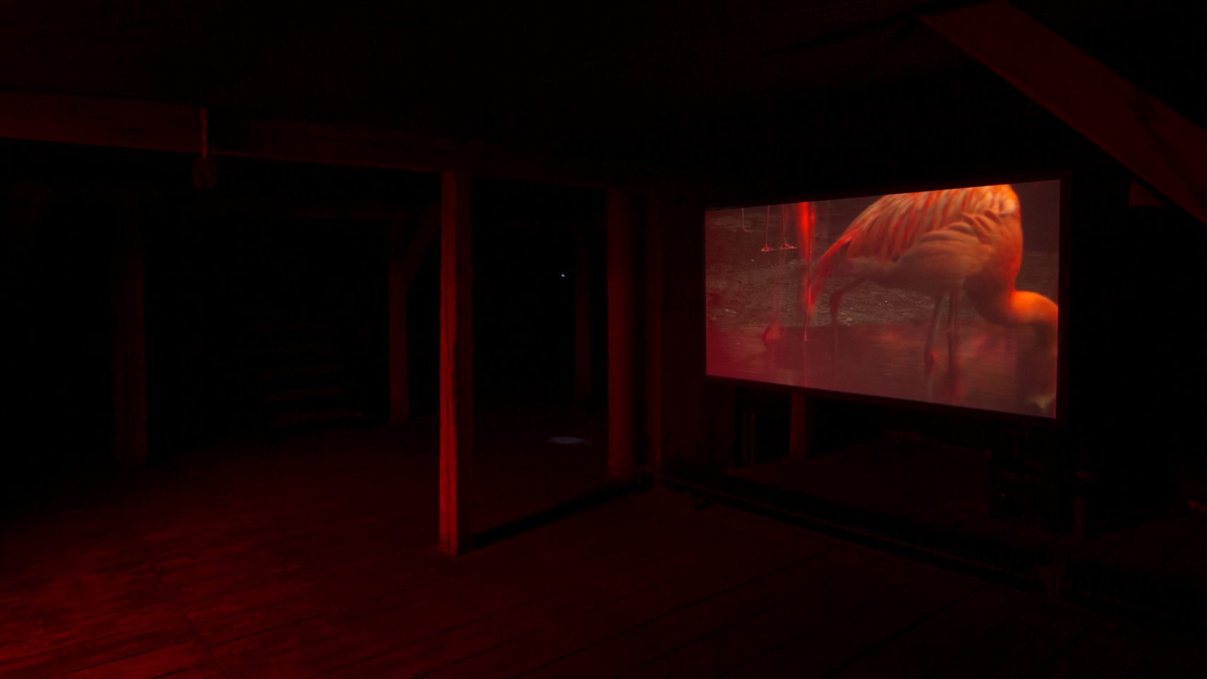 The projection showed a slow-motion recording of a group of flamingos gathered beside a waterhole,