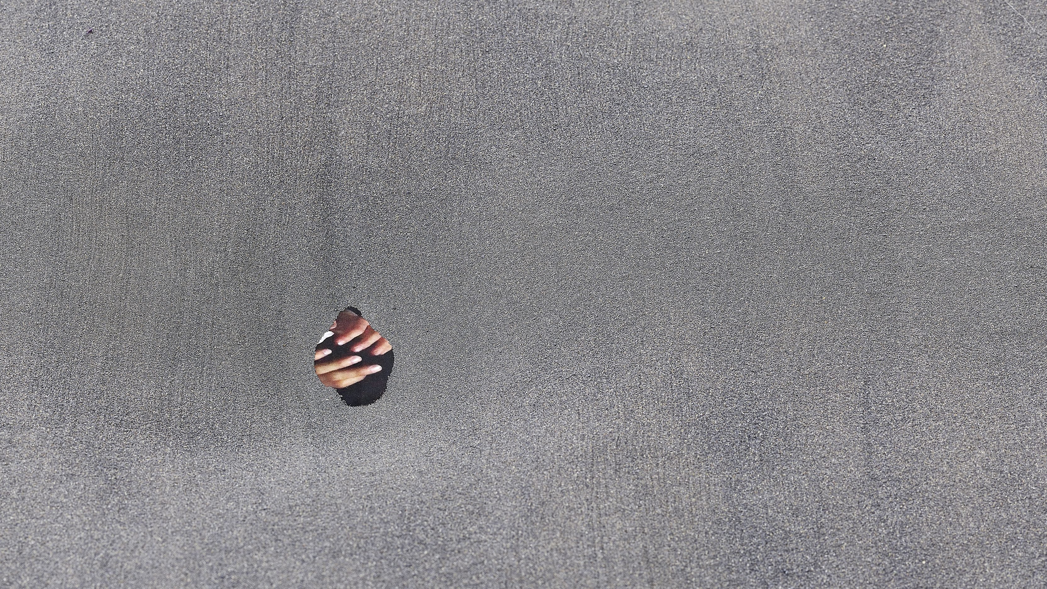 A display table flled with sand reveals photographs of hands in the moment of a touch.